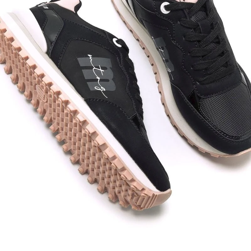 Compra en Decathlon Zapatillas de caminar para mujer mtng joggo-t en color negro Zapatilla deportiva Joggo Track mtng para mujer. De color negro, con detalles en rosa. Puntera almendrada y cierre con cordones negros planos. Nombre y logo de la marca en el lateral.